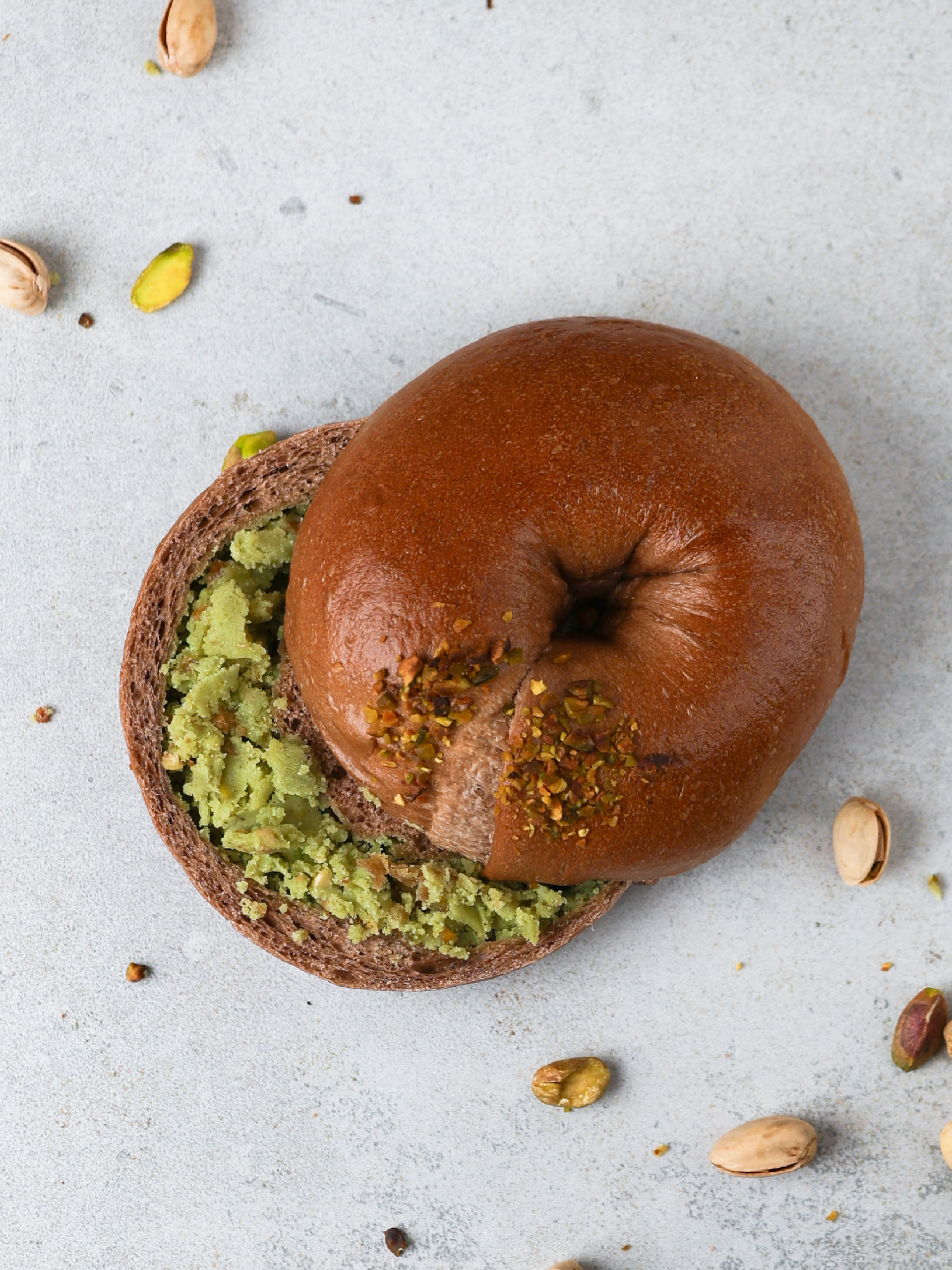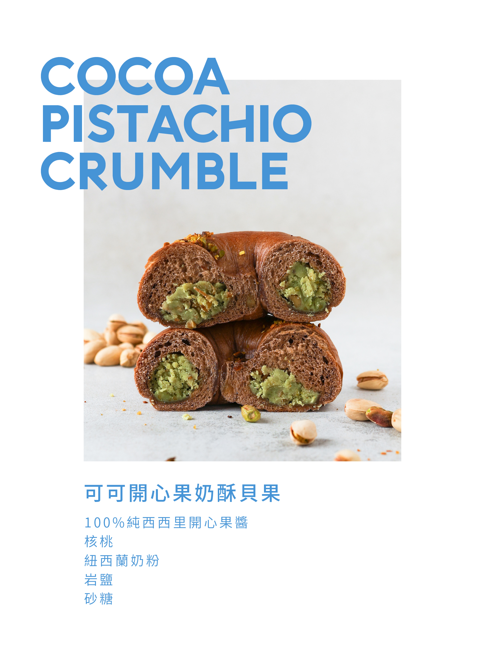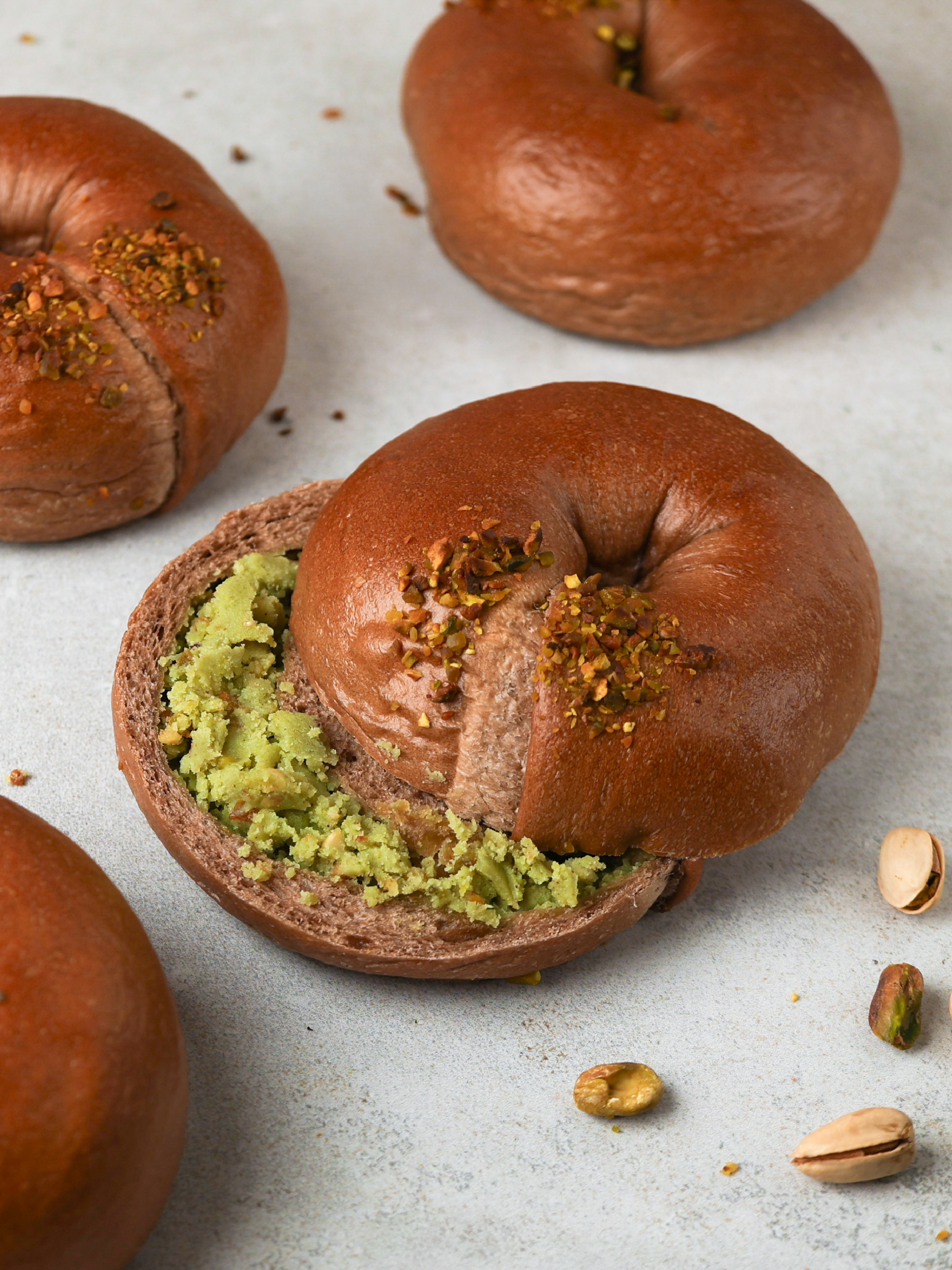 香氣濃郁的可可風味貝果,包裹香氣十足的開心果奶酥。