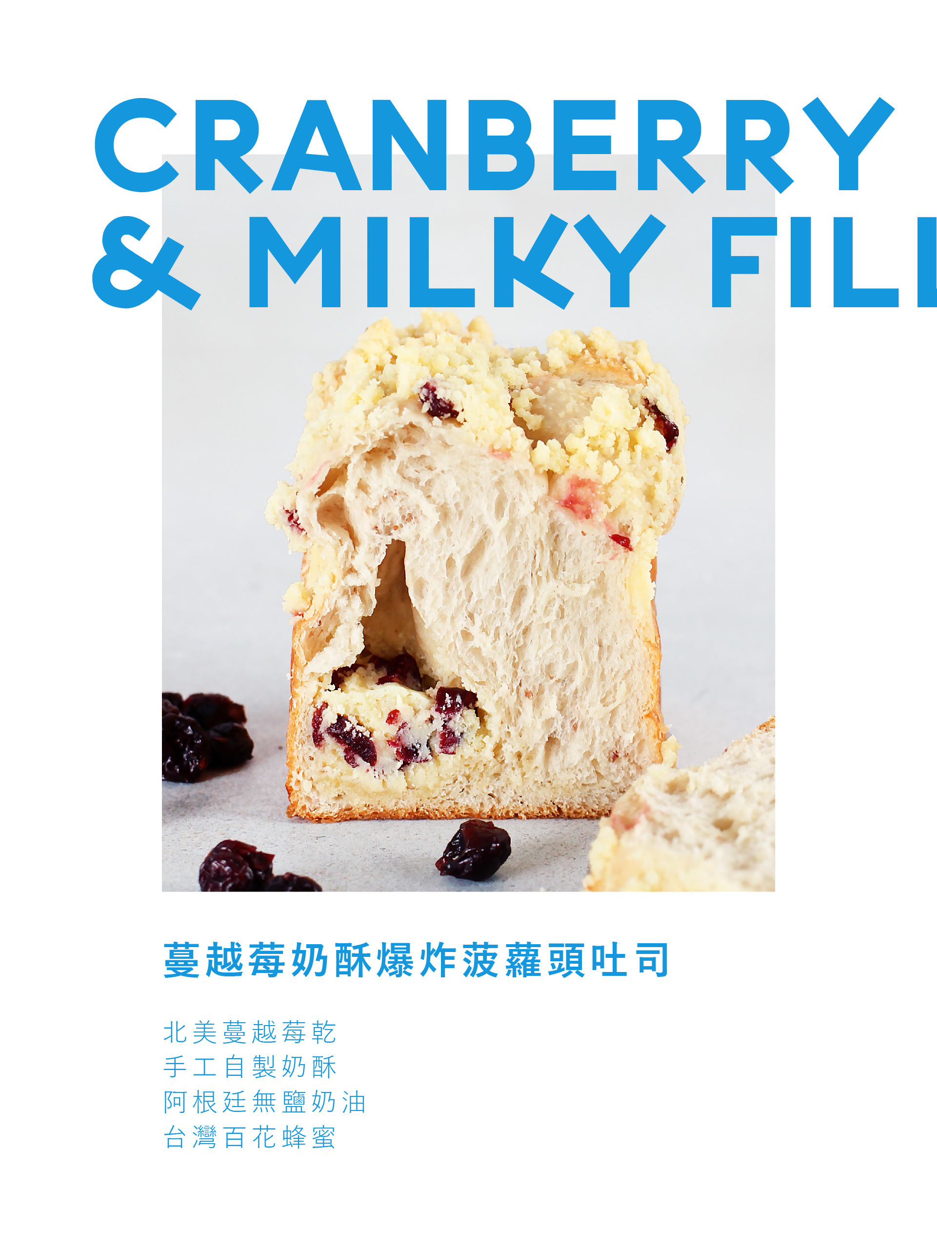 內容物:新鮮蔓越莓果乾、奶酥餡、酥菠蘿、自製草莓果泥