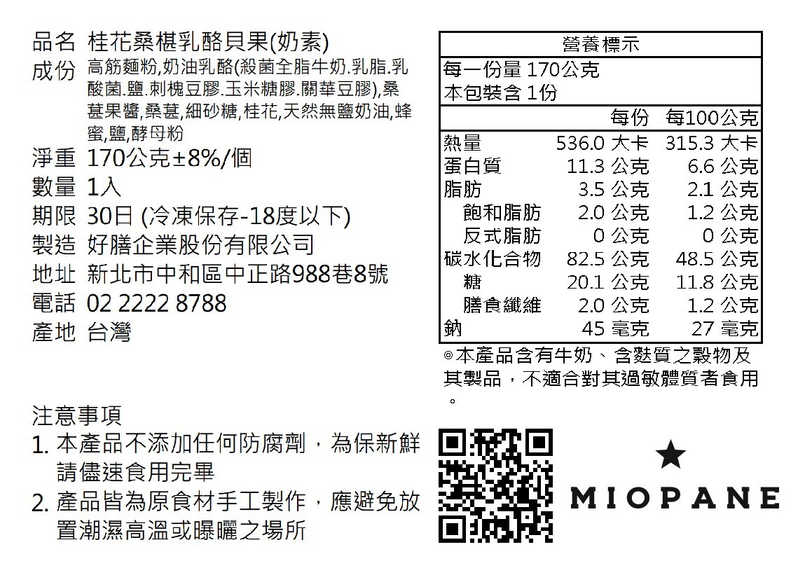 商品內容物: 高筋麵粉、海鹽、砂糖、奶油乳酪、桂花釀、桑葚果粒、天然無鹽奶油、蜂蜜、桑椹果醬