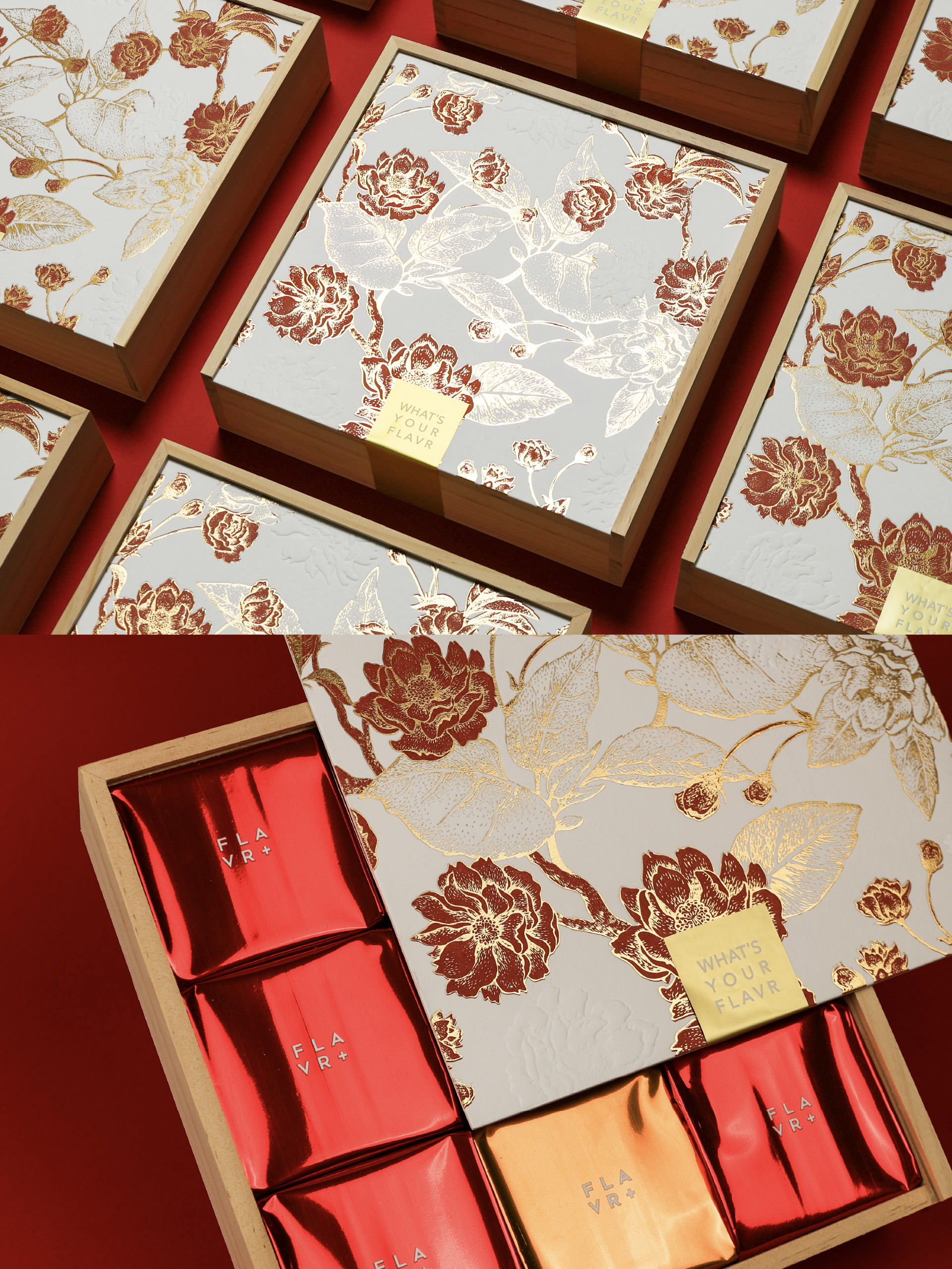 細緻花卉燙金浮雕包裝,如春花綻放般優雅亮眼。從外盒到甜點皆以「春意」為靈感設計,溫柔祝福一盒帶上。